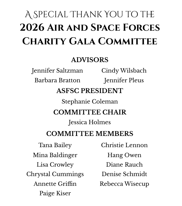 This remarkable feat is due to the efforts of the Air and Space Forces Charity Gala Committee. Year after year, a talented and energetic group of Air and Space Force spouses bring an extended community of donors and volunteers together to create an unforgettable evening. This year is no exception as we again strive once again to deliver a singular experience that will also make a positive impact in the lives of our Airmen and Guardians.